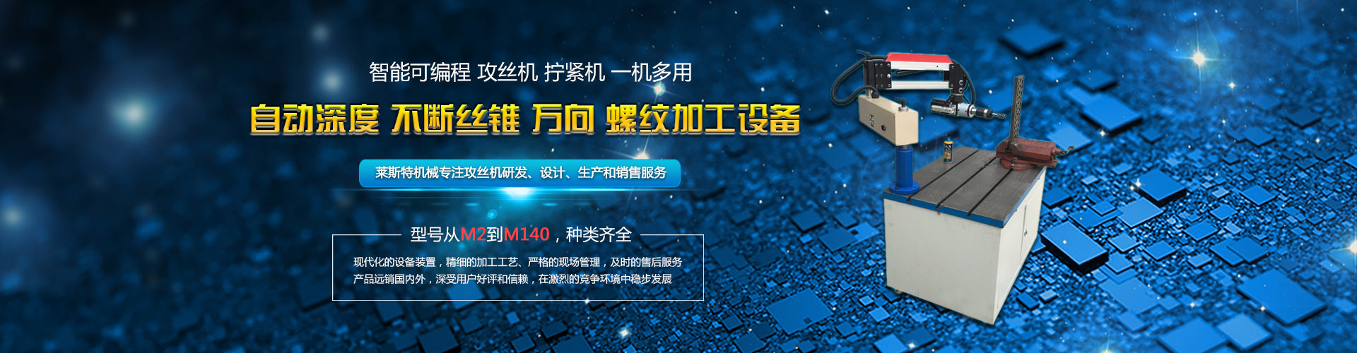 智能電動(dòng)攻絲機(jī)的制造專家專注攻絲機(jī)研發(fā)、設(shè)計(jì)、生產(chǎn)和銷售服務(wù) 服務(wù)熱線:18863624086 13864641383 友情鏈接:萊斯特機(jī)械廠